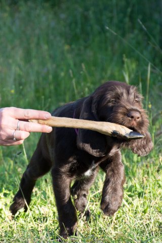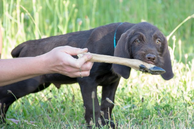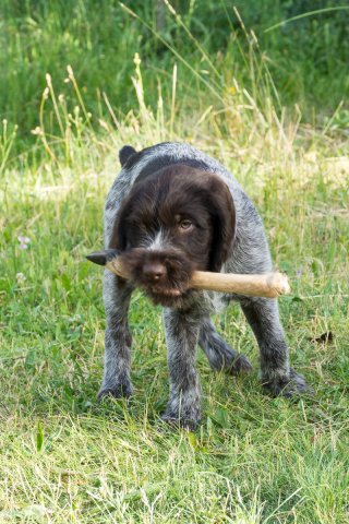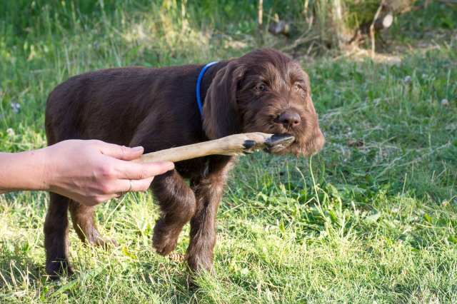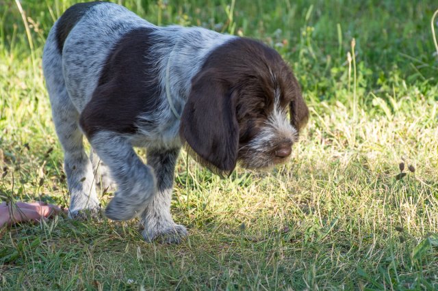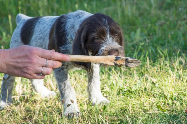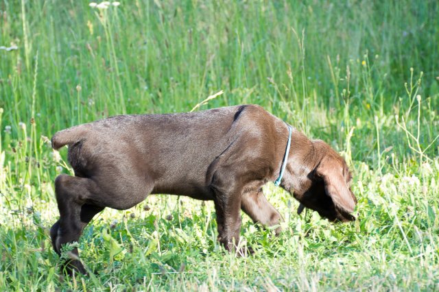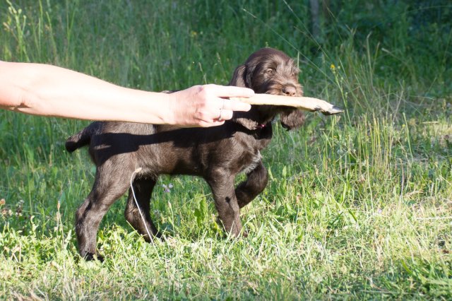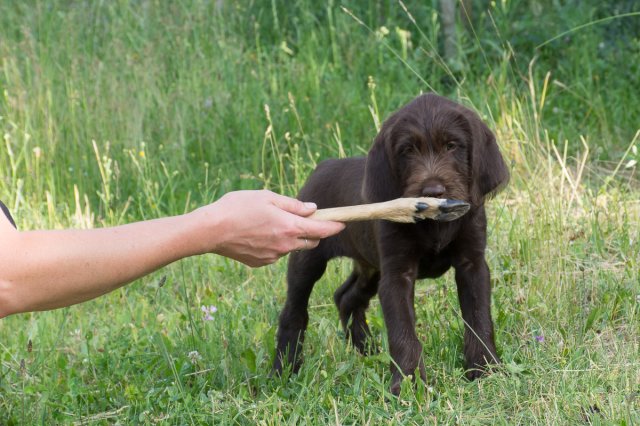 Štěňata dnes měla 57 den. Vytáhli jsme loňský spárek srnce a sledovali, co s ním každé štěně bude dělat. U některých byl již při navětření spárku pokus o vystavení a pokud jsme spárek pomale dávali pryč, tak tam byl i nesmělý postup. Zkrátka je v nich to, co tam má být.