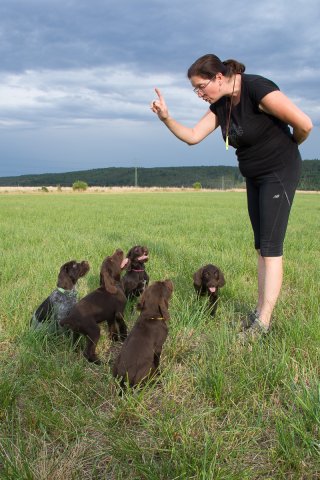 Učí se přivolání na jméno a sednutí na zdvižený prst.