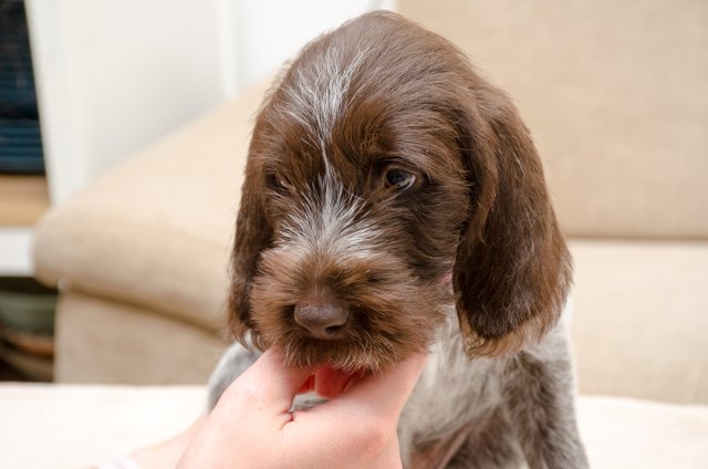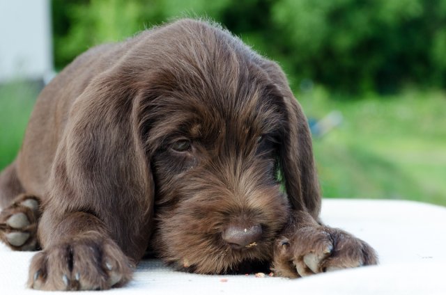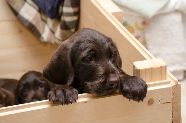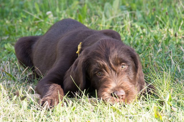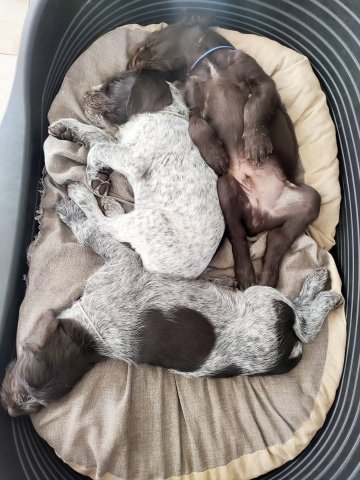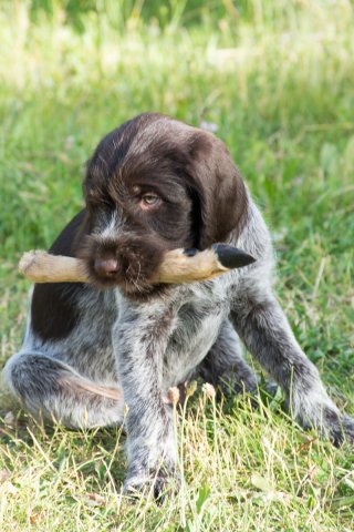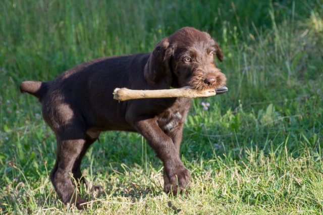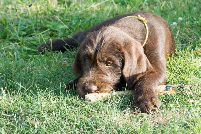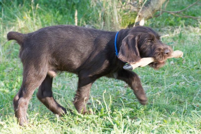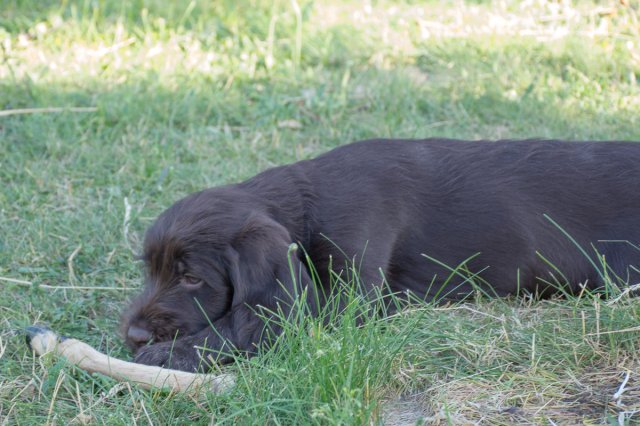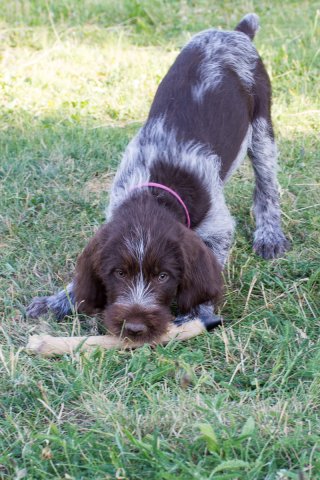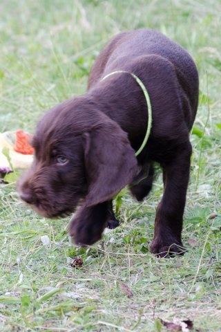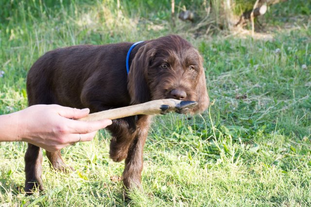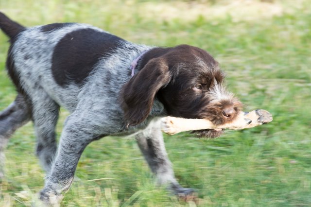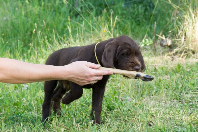 Štěňata dnes měla 57 den. Vytáhli jsme loňský spárek srnce a sledovali, co s ním každé štěně bude dělat. U některých byl již při navětření spárku pokus o vystavení a pokud jsme spárek pomale dávali pryč, tak tam byl i nesmělý postup. Zkrátka je v nich to, co tam má být.