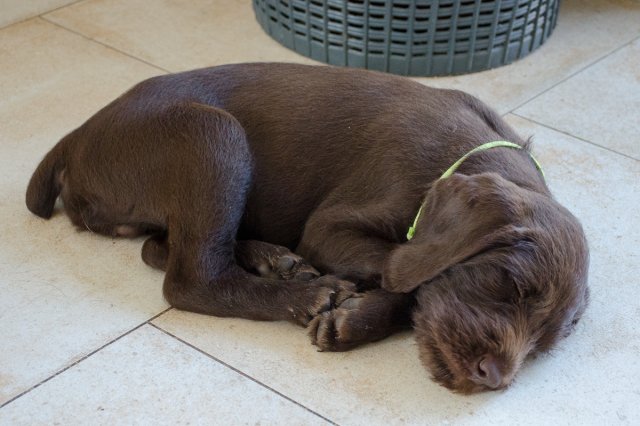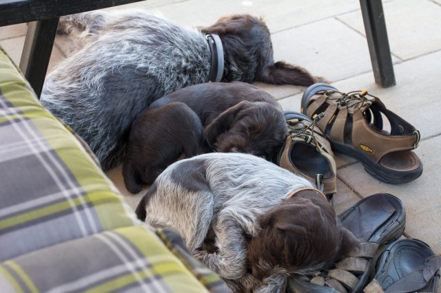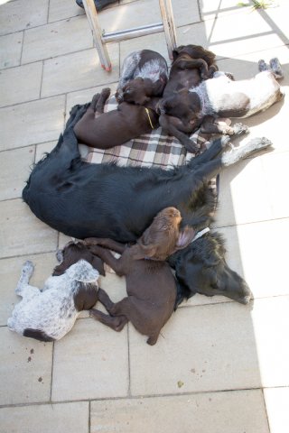 Poslední týden je ve znamení velkých veder, byť ráno jsou teploty překvapivě kolem 5°C. Štěňata jsou ráno chvíli venku, ale pak už většinou polehávají doma na dlažbě, případně ve stínu na terase. Našla si navíc kupu písku a hrabou a hrabou, až se prohrabou k vlhkému studenému vnitřku. Fotografií je proto málo, napravíme v týdnu.